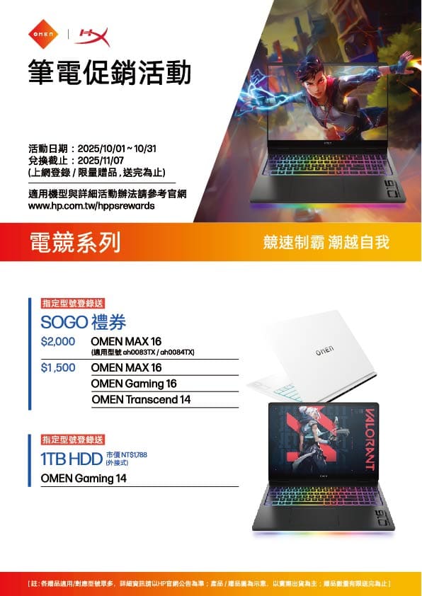 首頁 原廠促銷專區筆電促銷專區 筆電促銷專區 印表機促銷專區 本促銷專區為原廠季度促銷規劃,其間如有調整/異動 請以原廠官網 www.hp.com.tw 公告為準,HP 將保留活動修正/異動/調整取消之權利。 202509_NB通路DM設計_商務 下 載 202509_NB通路DM設計_OB輕薄 下 載 202509_NB通路DM設計_電競 下 載